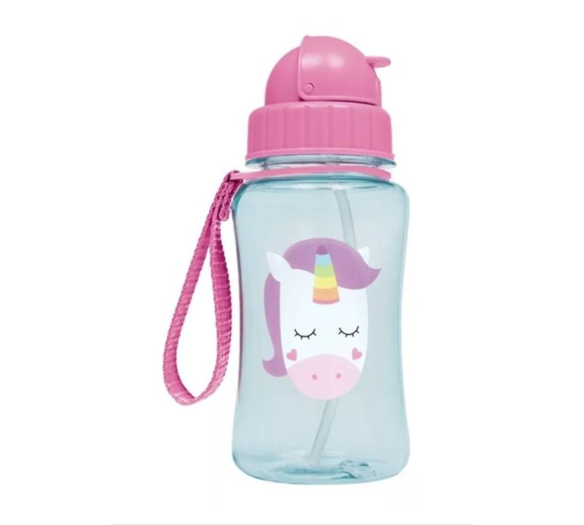 Botella infantil de 350ml con tapa flip-top, pajita retráctil de silicona y práctica pulsera de transporte. Colorida, divertida y perfecta para el uso diario.🦁🦄