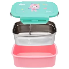 Lunchera Bento Box Zoo de 600ml, con compartimento de acero inoxidable libre de BPA, tapa antifugas y divisor ajustable. Ideal para mantener los alimentos organizados y seguros.